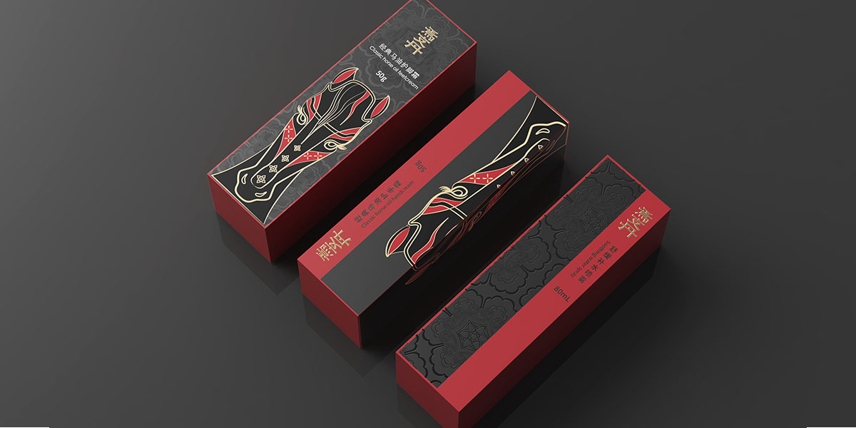 本方案增加兩種不同面霜瓶與包裝設計。左邊采用硬卡天地蓋形式,瓶身采用紅黑漸變,連接黑色瓶蓋,瓶蓋采用寶相花紋刻印,增加細節與層次感。天地蓋硬卡盒版設計增加馬頭燙金墊板,呼應品牌“馬油”印象。采用漆器紅黑配色,打造漢唐視覺效果,體現低調奢華的貴族氣質。